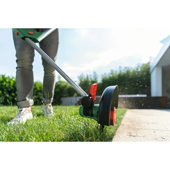 Der Akku-Rasentrimmer UniversalGrassCut 18V-260 verfügt über einen ergonomischen V-förmigen Griff mit Teleskop-Höhenverstellung für eine angenehme Handhabung und natürliche Körperhaltung. Die IntelliFEED-Funktion sorgt durch den automatischen Fadenvorschub für ein unterbrechungsfreies Arbeiten und es entfällt mühevolles Bücken bei der Gartenarbeit. Ein einfacher Wechsel von Trimmen auf Kantenschneiden wird durch den flexiblen Kopf erzielt, der über eine Fußpedaltaste rotiert. Zudem ermöglicht der schwenkbare Kopf das Trimmen von schwer erreichbaren Flächen. Ein Pflanzenschutzbügel schützt Pflanzen und Blumen bei nahem Trimmen. Ob Bohren, Reinigen oder Gärtnern – schneller und einfacher Wechsel zwischen verschiedenen Geräten mit dem 18 V POWER FOR ALL Akku von Bosch.