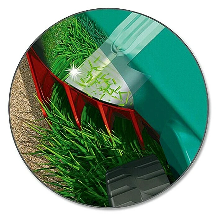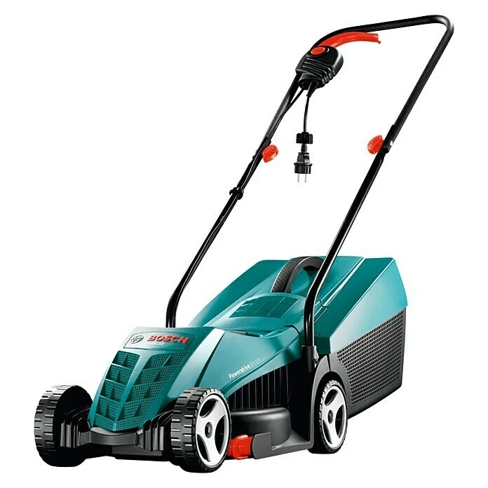 Der Bosch Elektro-Rasenmäher Rotak 32 ist ein kompaktes, handliches Gerät für Flächen bis ca. 150 m². Er zeichnet sich durch seinen besonders starken 1.200 W Powerdrive-Motor und den patentierten Rasenkamm aus. Der Kamm ermöglicht randnahes Mähen, ohne das Messer an Rasenkanten oder Abgrenzungen zu beschädigen. Die Räder sind leicht nach innen versetzt, sodass das Messer nahezu ohne Abstand zur Rasenkante arbeiten kann. Die Höhenverstellung erfolgt achsweise in 3 Stufen, wodurch eine optimale Anpassung an den Bedarf des Rasens gegeben ist. Das Schnittgut wird im Lieferumfang enthaltenen Grasfangkorb aufgenommen, der sich durch den oben angebrachten Griff gut entnehmen und einhängen lässt. Zum einfachen Verstauen und Transportieren ist der Führungsholm klappbar, hierzu müssen nur 2 Schrauben werkzeuglos geöffnet werden. Zum ausbalancierten Tragen ist an der Oberseite des Gehäuses ein Transportgriff vorhanden.