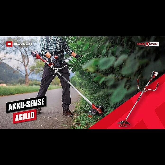 Die Einhell Akku Sense Agillo liefert im heimischen Garten eine beeindruckende Mähleistung bei angenehmer Handhabung. Ob unwegsames Gelände, Hänge, Böschungen oder Randstreifen, mit dem Akku Rasenschneider lässt sich kabellos und flexibel bei Gras und Grün arbeiten. Ausgestattet mit dem Einhell Brushless Motor, einem bürstenlosen Elektromotor, liegt die Sense sicher in der Hand dank universell einstellbarem Zweihandgriff. Die Drehzahl wird elektronisch reguliert. Das hochwertige 3-Zahn-Messer arbeitet sich mühelos durchs Grün, das Spindle-Lock-System erlaubt einen einfachen Wechsel der Schneidgarnitur. Dank Split Shaft sind ein einfacher Transport und eine platzsparende Aufbewahrung gewährleistet. Ermüdungsfreies Arbeiten ermöglicht der hochwertige Komfort-Tragegurt und der Alurohrführungsholm sowie der Softgrip für ergonomische Arbeitsweise. An eine praktische Wandhalterung wurde ebenfalls gedacht. Die Motorsense ist Mitglied der Power X-Change-Familie. Alle Akkus der Systemreihe können in den Power X-Change-Geräten angewendet werden. Die Akku-Sense wird mit zwei 18 V-Batterien betrieben. Akku und Ladegerät sind separat erhältlich.