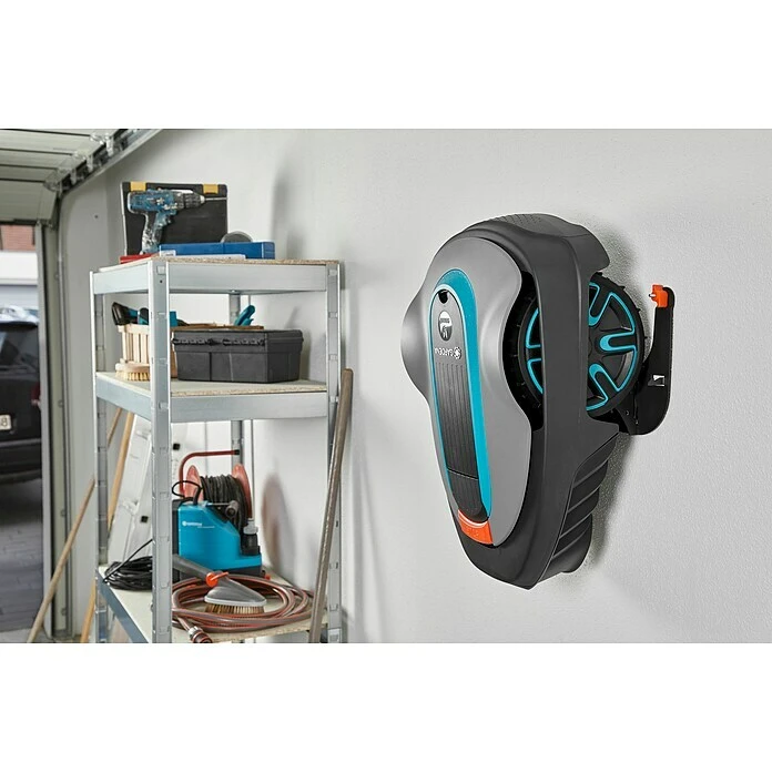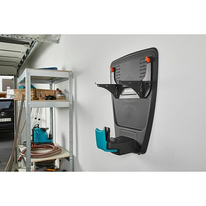 Mit der Gardena Wandhalterung lassen sich die Gardena Sileno Mähroboter der Reihen minimo, city und life bei Nichtbenutzung platzsparend und gut geschützt aufbewahren. In der robusten Metall-Halterung findet nicht nur der Mähroboter, sondern auch die Ladestation Platz.