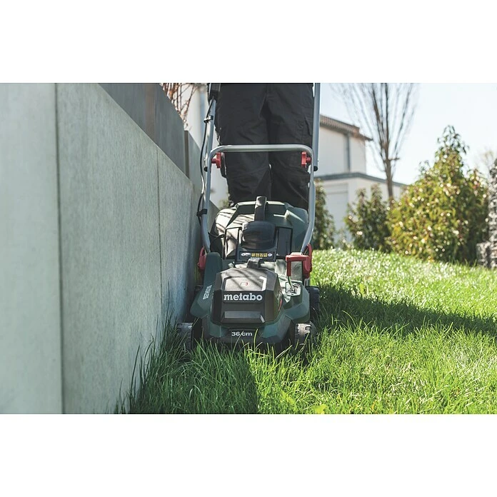 Der kompakte, wendige Akku-Rasenmäher ist zum randnahen Mähen und Mulchen von Grundstücken bis 350 m² geeignet. Das Mähgut wird wahlweise im flexiblen Fangsack gesammelt oder sofort zum Verbleib auf der Grünfläche gemulcht. Der starke Brushless-Motor garantiert hohe Schnittperformance und lange Laufzeit pro Akkuladung. Die einfach bedienbare Schnitthöheneinstellung kann zentral in 5 Stufen eingestellt werden. Durch das hochwertige Sichelmesser und integrierte Rasenkämme ist Randnaher, sauberer Schnitt möglich. Ergonomisches Arbeiten dank höhenverstellbarem Schiebebügel mit gummiertem Griffbereich und einfaches Manövrieren dank leichtem Kunststoffdeck. Der Transport und die platzsparende Lagerung werden durch Tragegriffe und zweifach klappbaren Bügel mit Schnellspanner vereinfacht. Der Fangsack mit Füllstandsfenster ist im Lieferumfang enthalten. Durch leisen Akkubetrieb ist der Rasenmäher besonders Umweltfreundlich und dadurch auch in lärmsensiblen Bereichen einsetzbar. 100% Kompatibilität zur 18-Volt-Klasse: kraftvoller 36-Volt-Betrieb mit zwei 18-Volt-Akkupacks von Metabo. Kombinierbar mit allen 18V-Akkupacks und Ladegeräten der CAS Marken: www.cordless-alliance-system.com.