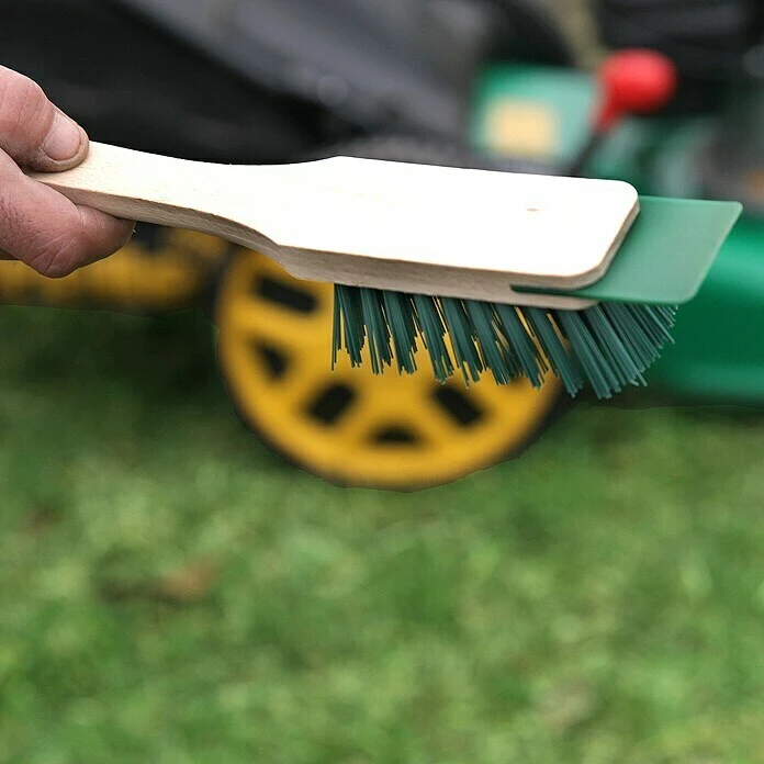 Mit dieser Rasenmäherbürste lässt sich Ihr Rasenmäher ganz einfach reinigen. Der Griff der Bürste besteht aus Holz, die Borsten aus robustem Elaston. Die Bürste ist vorne mit einem praktischem Kunststoffschaber ausgestattet.